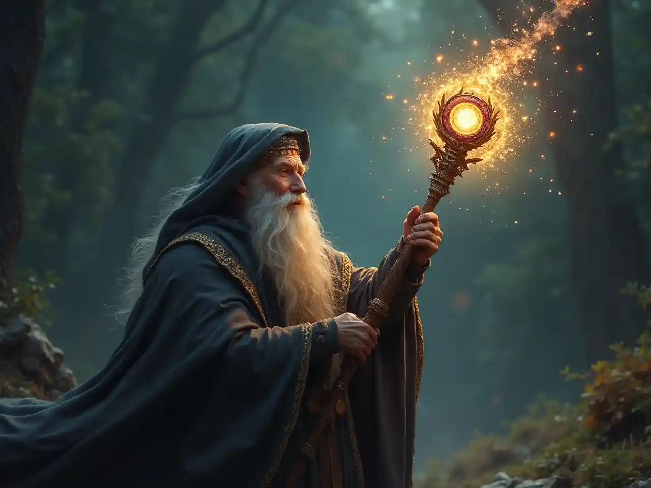 นักมงคลโลกผู้สูงอายุที่มีความรู้สูงขึ้นไม้เท้าลึกลับและเวทย์มนต์ของเขาในอากาศ แสดงว่าพระเครื่องสูงสุดจากโลกอื่น