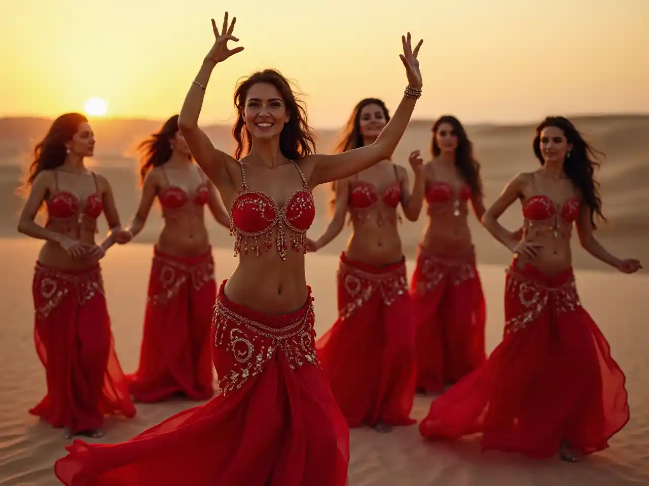 ภาพแสดงกลุ่มผู้หญิงในชุดเต้นหน้าท้องสีแดงแบบดั้งเดิม ที่ตกแต่งด้วยโลหะและขีด