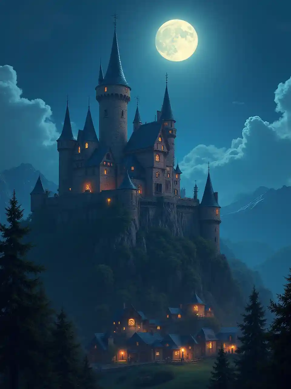 ความเป็นจริง ปราสาทมาเลนดราฟ เป็นปราสาทที่ยิ่งใหญ่ ที่ถูกส่องแสงของดวงจันทร์ ในตอนกลางคืน ล้อมรอบด้วยภูมิทัศน์ที่ร่มรื่น และฟ้าที่ชัดเจน หลังคาสูงๆของปราสาท ส่องแสงแสงเดือน ส่งความรู้สึกของความหวังและความสงบ หมู่บ้านที่มีชีวิตอยู่ข้างล่าง ภาพที่น่าทึ่งที่ชวนให้สํารวจและความเป็นจริง ความละเอียดสูง คุณภาพ 4K