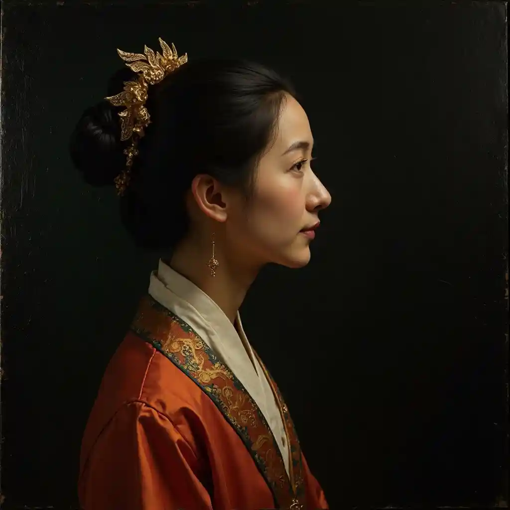 ผู้หญิงจีนที่สวมเสื้อผ้าจีนประจําศตวรรษที่ 18 มองไปทางขวาในรูปแบบ และคุณเห็นแค่ด้านหนึ่งของใบหน้าของเธอ มันกลางคืนแล้ว หลังเป็นสีดํามาก มันอยู่ในสไตล์ของภาพวาดของเรมบรนท์