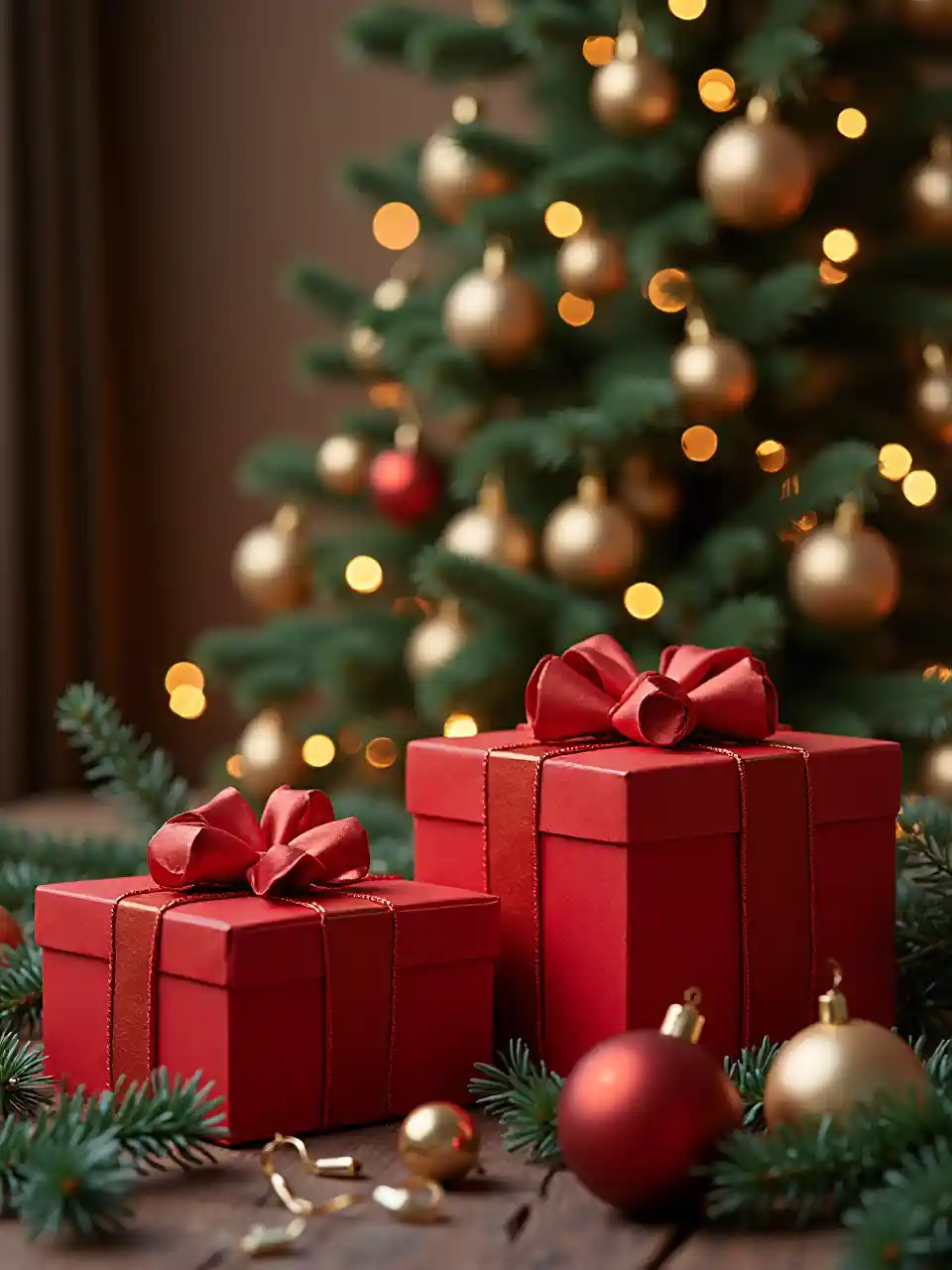 rubylynกล่องของขวัญสีแดงคริสต์มาส กับต้นคริสต์มาส ลูกคริสต์มาสสีทอง และแสงคริสต์มาส