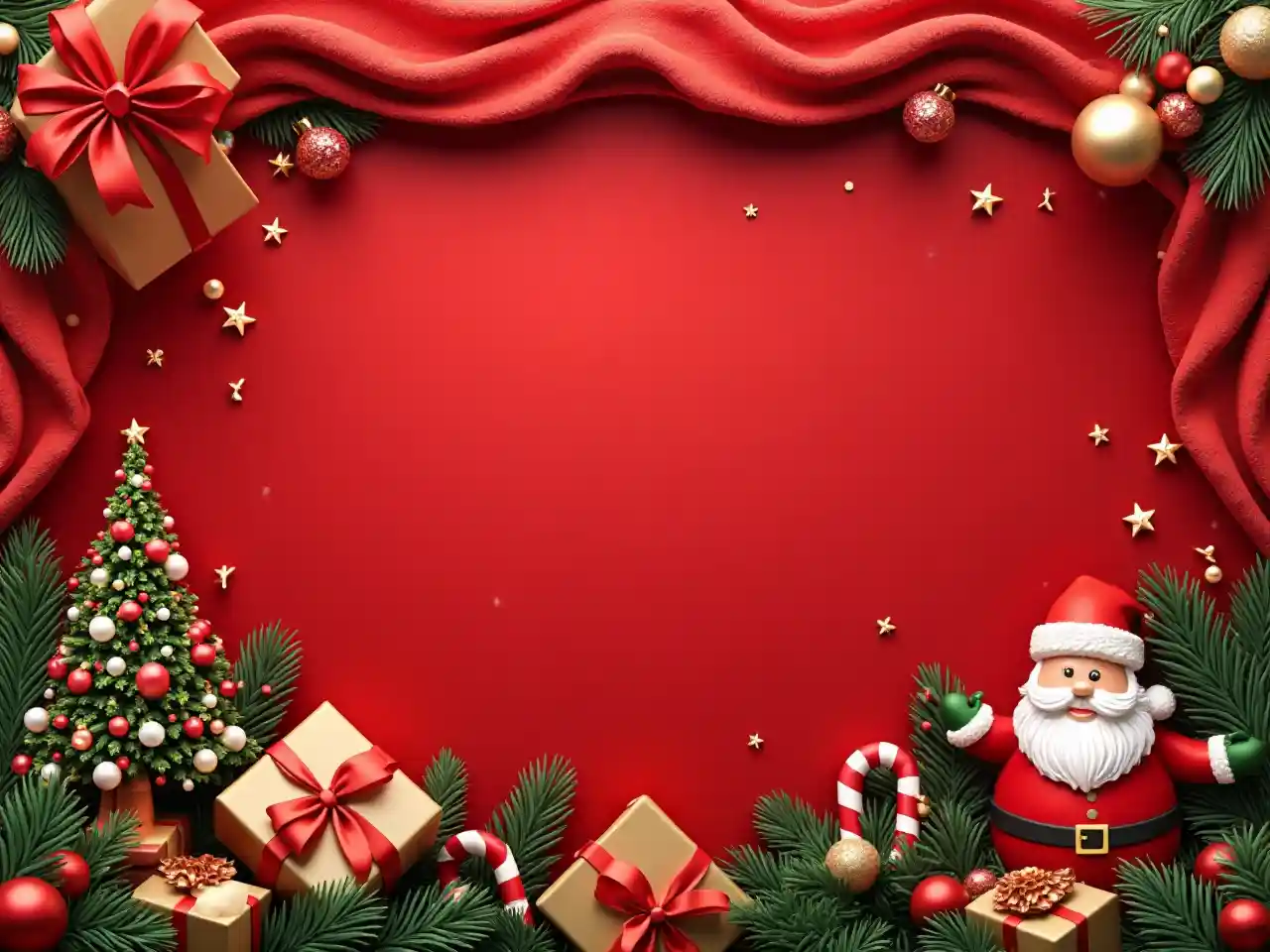 kinda 3D ออกแบบโปสเตอร์ประเด็นคริสต์มาสที่มีความสุข, วางเครื่องประดับที่ซับซ้อนและสดใส โดยเฉพาะตามขอบด้านล่างเท่านั้น ด้านล่าง, อนุญาตให้กลางว่างกับพื้นหลังสีแดงเท่านั้น โดยไม่มีเครื่องประดับ, บนเพิ่มผ้า shawl แดงที่เรียบง่ายเพียงไม่มีองค์ประกอบหรือเครื่องประดับ, ใช้สีแดง, เขียว, ขาว, และทองคํา, ในขณะที่รักษาการวางที่สะอาด แต่สดใส เหมาะสําหรับข้อความและองค์ประกอบ, รวมเครื่องประดับที่มีความสุข เช่น กล่องของขวัญ, สวยไม้คริสต์มาสที่มีเครื่องประดับ, แคนนต์, และอื่น ๆ, สร้างสรรค์ UHD 40K สําหรับโปสเตอร์