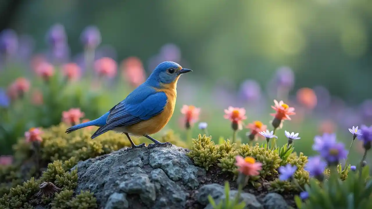 นกสีฟ้าสีฟ้า (((เล็ก ๆ)) กับ ((สีสดใส)) ที่เลียนแบบสาระสําคัญของภูมิทัศน์ธรรมชาติ นั่งมั่นใจบน (หินที่อากาศอ่อน) อยู่ใน (สนามของดอกไม้สี) ภาพถูกจับด้วย (กรองสีที่สดใส) ที่นําความละเอียด (สีเขียวและสีม่วง) ในดอกไม้, ให้ความแตกต่าง (น) กับ (ใบมีย) ที่สร้างความฝัน, เกือบ surreal