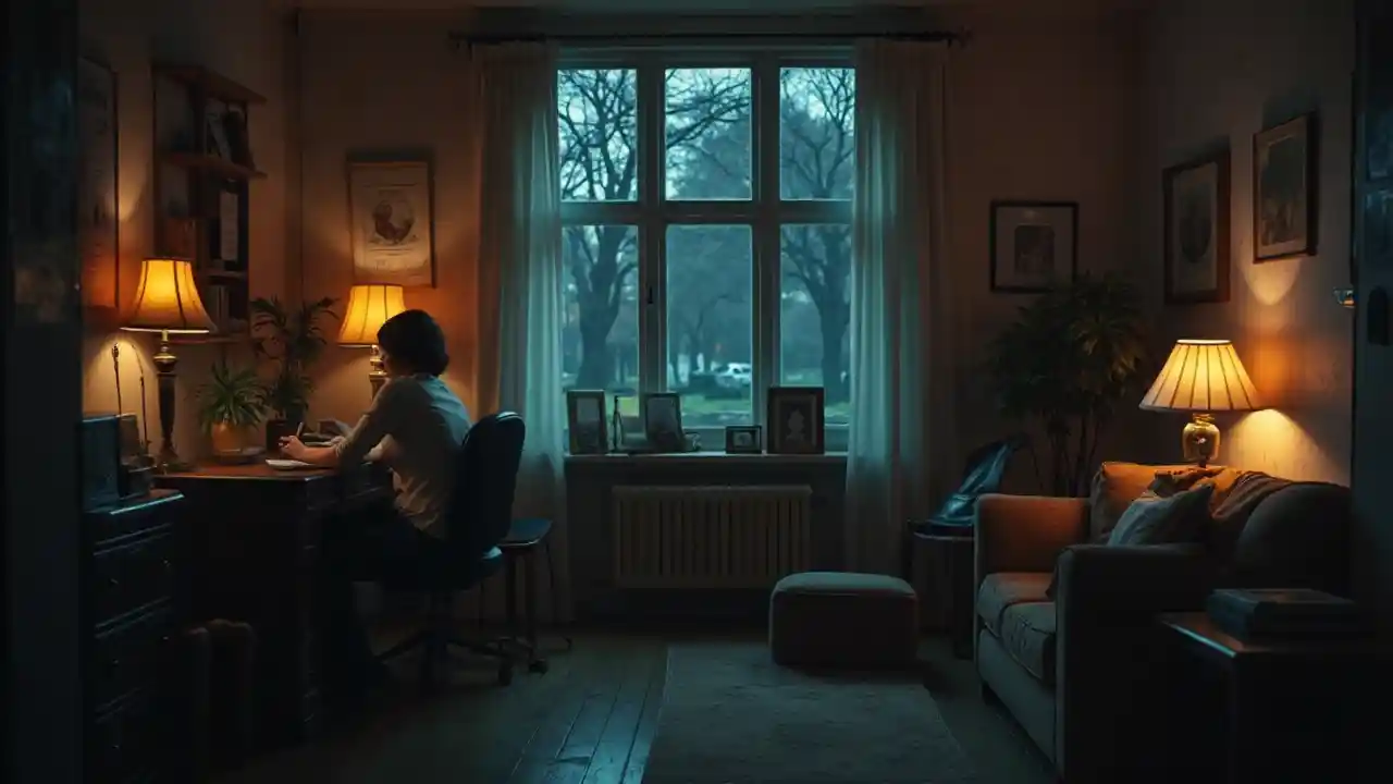 ห้องที่อุ่นและสว่างไม่ดี มีแสงอ่อน, การตกแต่งโบราณ, และหน้าต่างที่แสดงถนนที่ฝนตกในตอนกลางคืน สีเพสเทลและเนื้อเยื่อที่มีเมล็ดด้วยบรรยากาศสงบและความคิดถึง