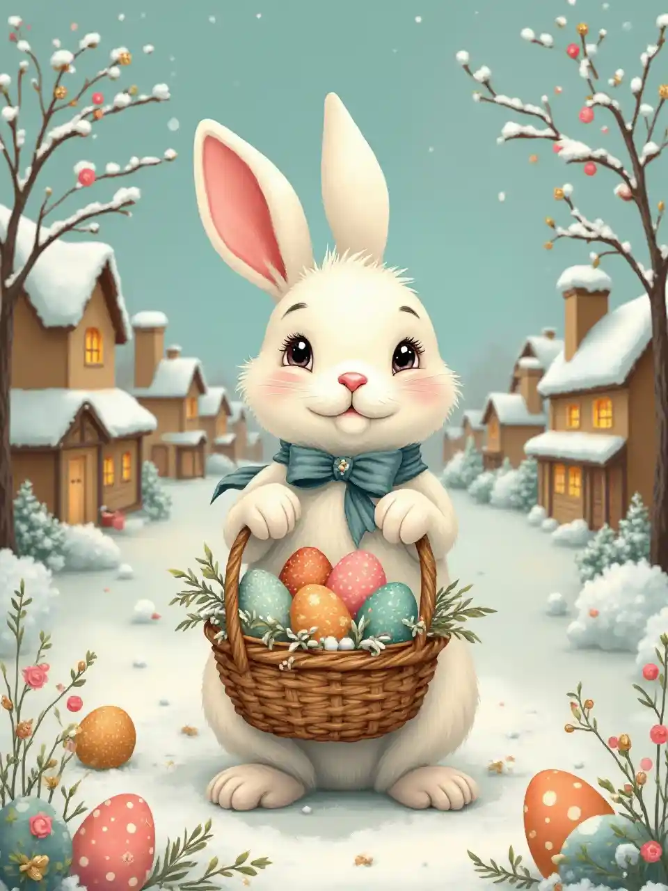 ภาพวาดวินเทจของกระต่ายอีสเตอร์สีขาว พร้อมกับกระเป๋ไข่อีสเตอร์เต็ม สีพาสเต แต่งสวยเป็นทอง รายละเอียด มีเมืองฤดูหนาวในพื้นหลัง