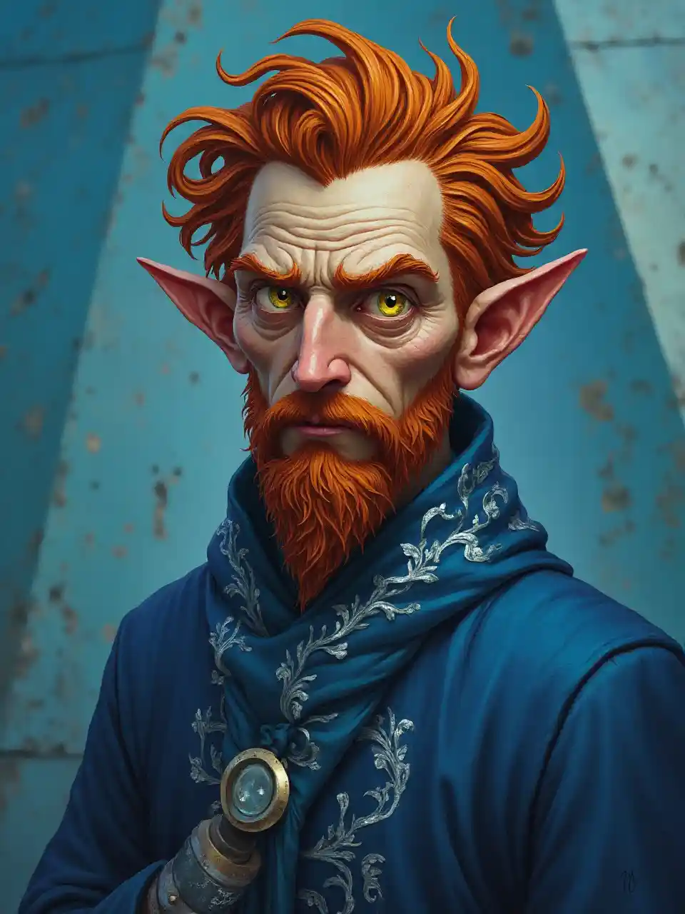 นักเวทย์หูเดียว ทรงผมแดง และสวมสีฟ้า