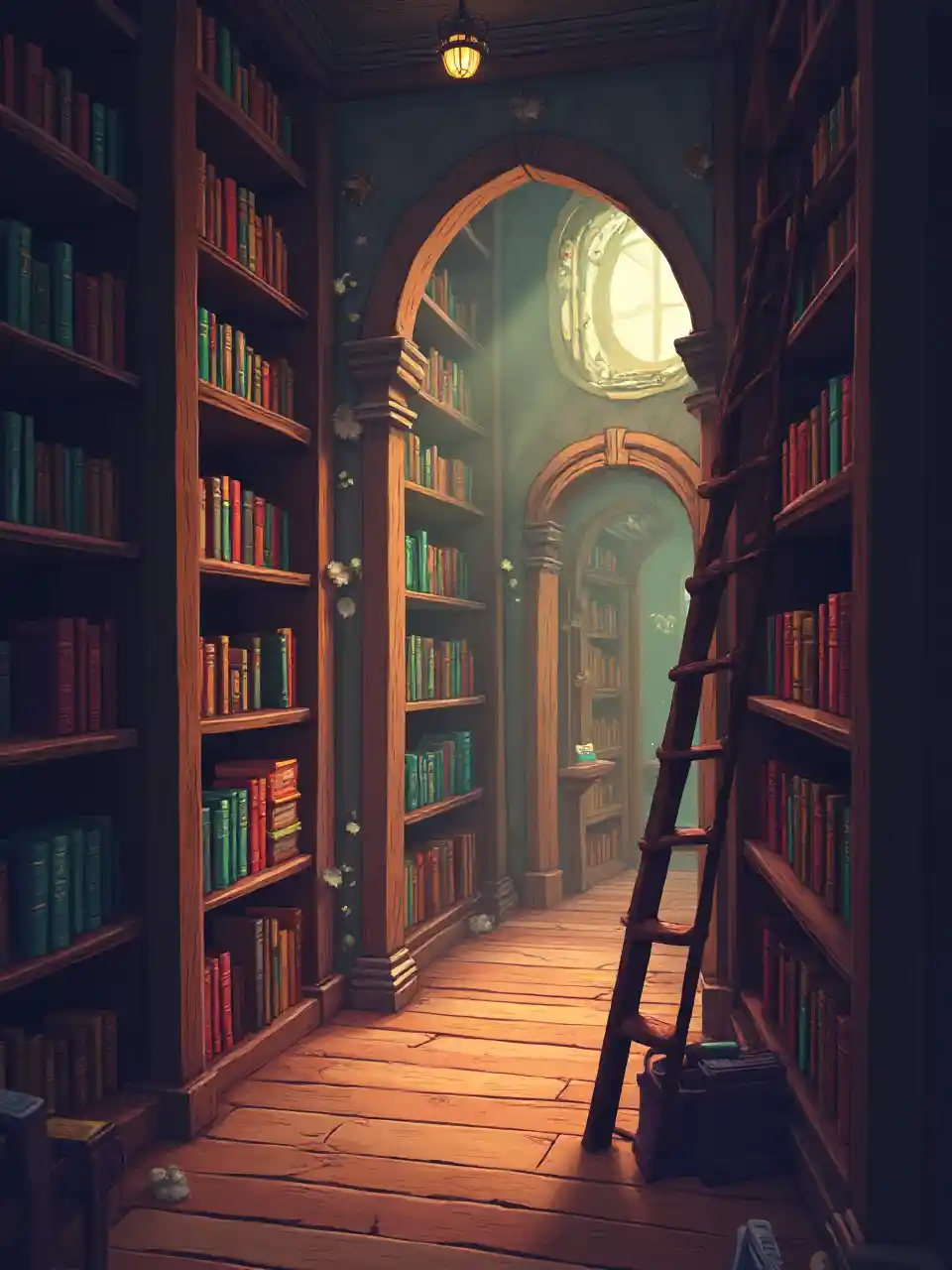 ลานห้องสมุดที่ลึกลับเต็มไปด้วยชั้นหนังสือไม้สูง ที่ถึงเพดาน แสงอ่อนนุ่มอบอุ่น บรรยากาศที่น่ารักและลึกลับ รายละเอียดที่รวย กระสุนที่ส่องในอากาศ สไตล์การ์ตูนที่น่าหลงและน่าหลง อิลลัสทรา 2 มิติแบบแฟนตาซี มีเนื้อที่ซับซ้อน สภาพที่น่าทึ่ง ไม่มีตัวอักษร