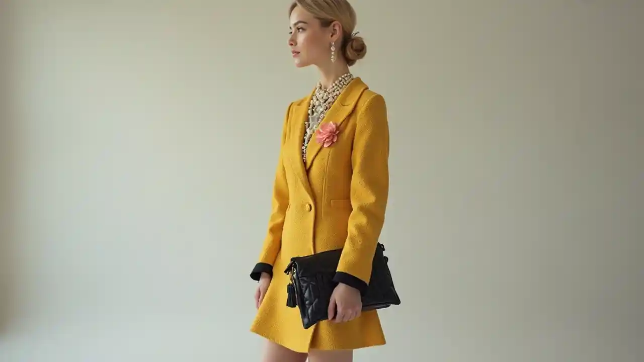 สตูดิโอถ่ายรูปรูปแบบยาวเต็มรูปแบบยาวเต็มรูปของผู้หญิงที่น่ารักมาก กับผมบลอนด์ที่สวมใส่ในบ๊อบ ((ใส่ชุดสีเหลืองกับการตัดสีดํา เธอถือชุดคลุมคลุมคลุมคล้ายกับเก่า)) ซึ่งเน้นถึง (((รูปทรงที่น่าอัศจรรย์)) และดึงความสนใจไปที่ (((ขาที่สวยงาม))) แหวนห้อยสีชมพูทรงหัวใจ, necklace ยืน โป๊สแบบ