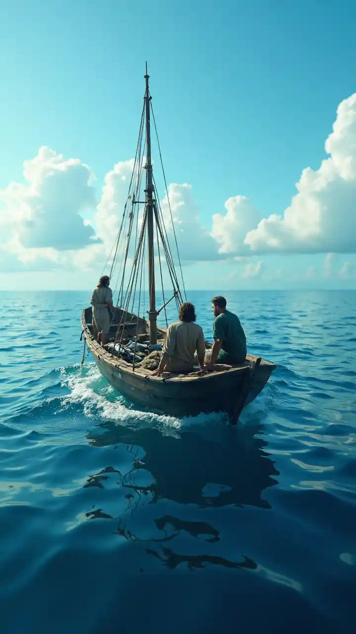 (เรือเล็ก) ที่มองไม่เห็นได้เลย กลางทะเลกว้าง (กลางทะเล) มีรูปตัวเล็กๆ ที่ลอยลงมาในสายที่ไม่สิ้นสุดของ (ชัดเจน) พวกนั้นเป็นชายที่มีขนมีบ และหน้ากว้างบาง คนประมง ที่สวมเสื้อเก่าๆ ที่สวมเสื้อเก่าๆ เสื้อของประมงสวมเสื้อเก่าๆ และมีสีสี ภาพถ่ายนี้มาจากมุมสูง มองลงบนเรือเล็ก ๆ เหมือนจากบนของเรือใหญ่
