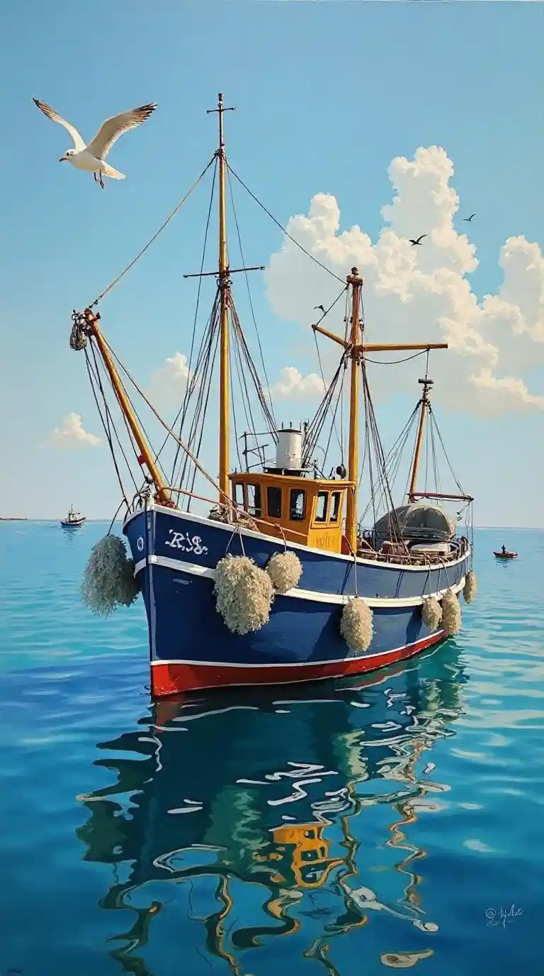 ภาพวาดน้ํามันที่สดใสของเรือประมงบนทะเล โดยมีนางเล่ รูปถ่ายที่ถ่ายด้วยไอโฟน และโพสต่ออินสตาแกรม ภาพถ่ายนี้ถูกจัดขึ้นในพื้นหลังของน้ําสงบ, สร้างบรรยากาศที่สงบ. เรือมีหลายเครือแขวนอยู่ข้าง