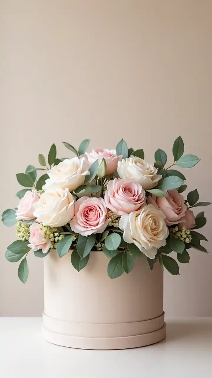 การจัดดอกไม้ด้านหน้าในกล่องที่หรูหราและซับซ้อนที่มีดอกไม้หรูหราที่มีสีเฉพาะ เช่น ดอกกุหลาบ, lisianthus, peonies, wax, limonium และ eucalyptus กับพื้นภาพสีที่นุ่ม