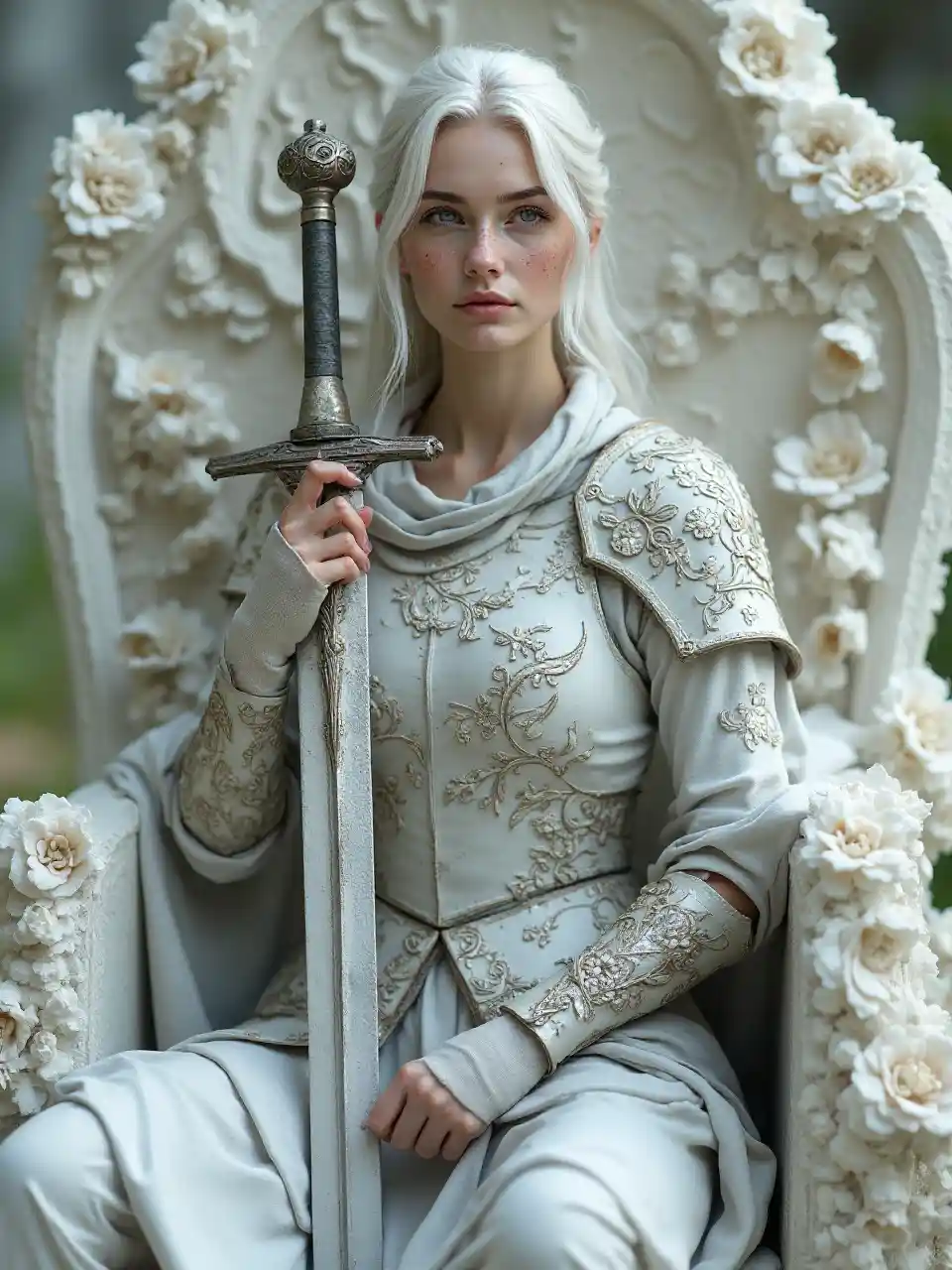 Emmaผู้หญิงขาวสวย + นักรบ + ผมขาว + ตาเทา + เบาะ + เสื้อเกราะลายดอกไม้ + ดอกสีขาว + เบาะ + ดาบใหญ่ +