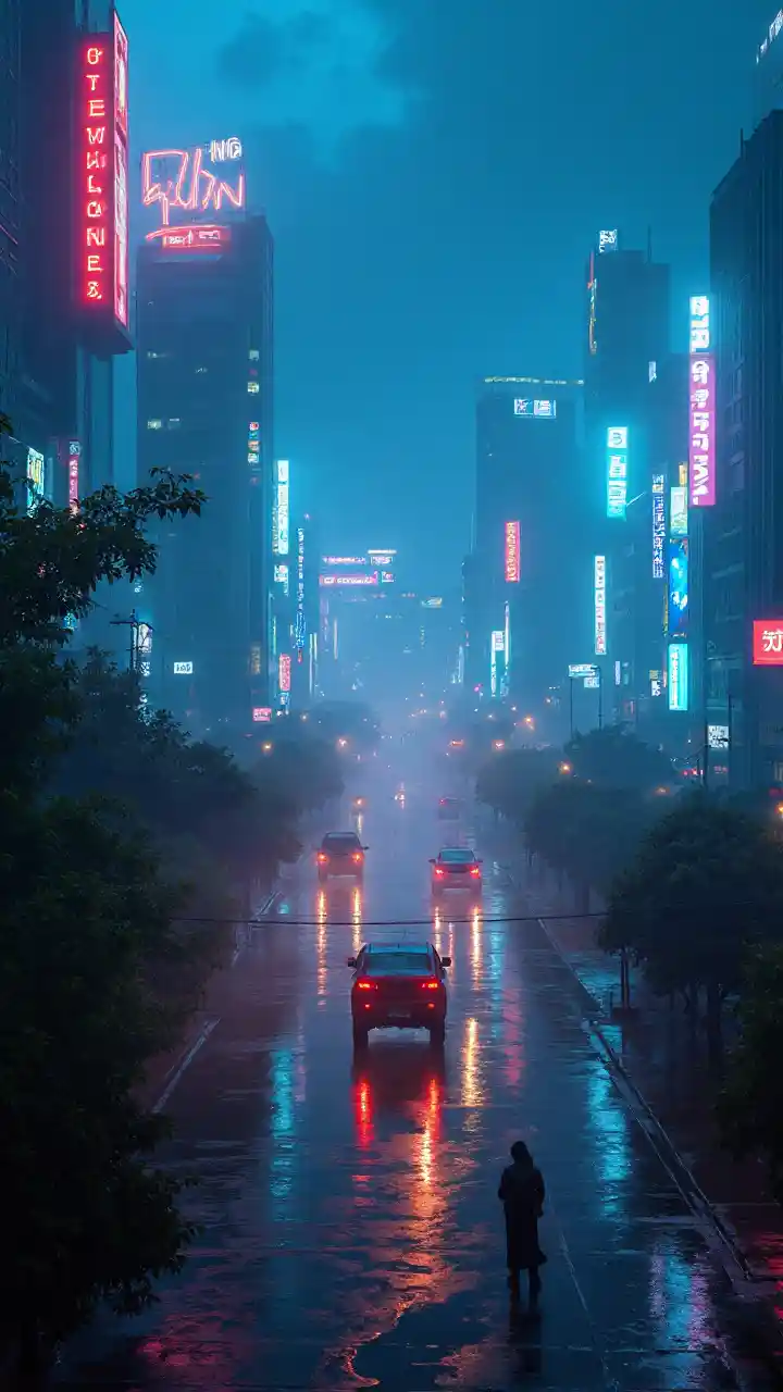 การ ดู จาก ท้องฟ้า ใน กลางคืน ของ เมือง ใหญ่ ใน อนาคต ใต้ ฝน