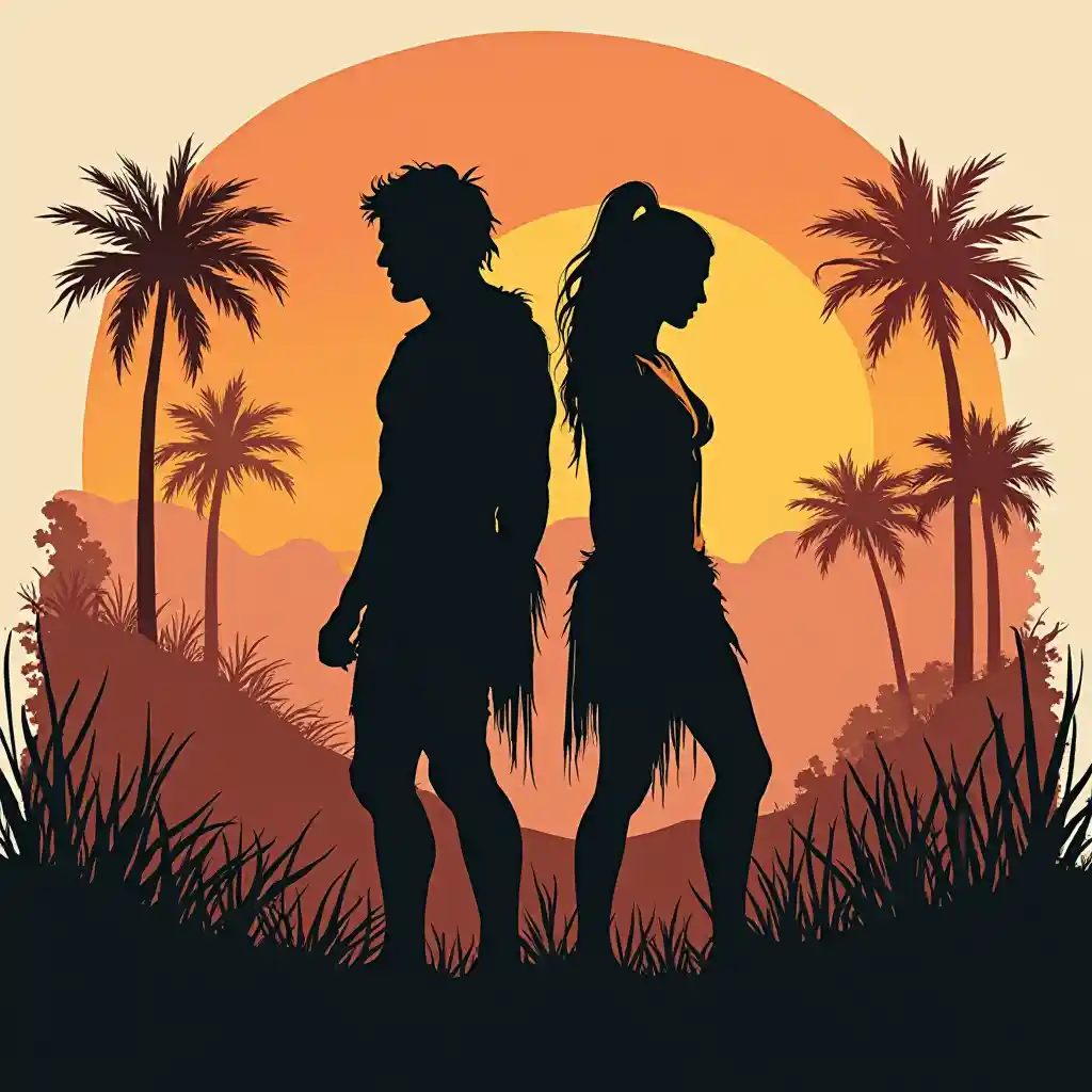 (หน้า:2:0) (ภาพคอลลาจชั้นของเกม:2:0) (ศูนย์กลาง:2.0) (ชั้นสีดําของหญ้าสั้น:2.0) (ชั้นของตัวละครผู้รอดชีวิตของมนุษย์ยืนอยู่หลัง; นักรบชายที่แข็งแรงและนักรบหญิงสาวที่สวยงามในชุดมนุษย์ถ้ําสมัยก่อน, รายละเอียดสูง, สีเต็ม, Hyper-Realistic:2.0) (ชั้นสีดําของหญ้ายาวและต้นไม้:2.0) (ชั้นสีดําของต้นไม้และต้นปาลม:2:0) (พื้นของวันตกในสีส้มและชมพู:2.0) (แสงเบื้องหลัง:2.0),
