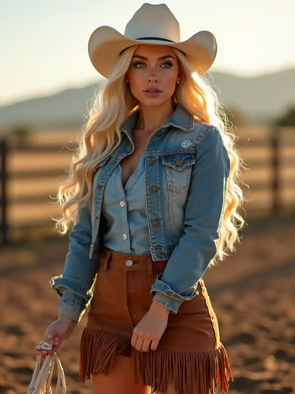 ราชินีดรากโรเดโอที่กล้ามเนื้อ 21 ปี มีผมบลอนด์ยาว ตาสีฟ้าสดใส (เส้นคอและคางชายที่แข็งแรง) แต่งตัว (เสื้อเดนมสีฟ้าที่มีรายละเอียดขาว) (เสื้อแชมบรย์) (กระโปรงขาว) (รองเท้าคาวบอยสีขาว) (หมวกคาวบอย) จับลัส โคมแสง สภาพจริง เป็นมืออาชีพ รูปทรงโค้กสูง เนื้อที่ละเอียด เนื้อที่ที่ชัดเจน อากาศอบอุ่นและชวนให้ใช้