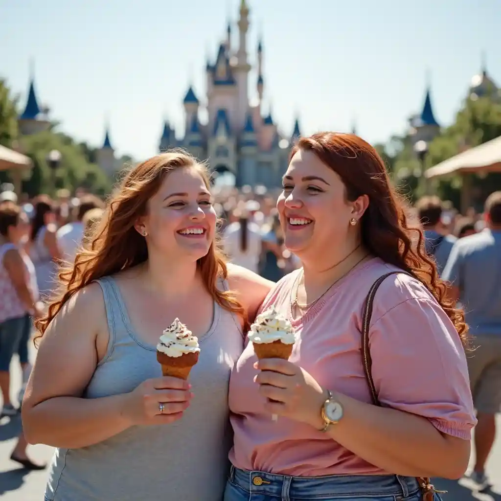 (แม่และลูกสาวมีความสุขเพลิดเพลินกับไอศกรีม) วันที่แดดในดิสนีย์แลนด์ (ผมขิง) เสื้อผ้าประจํา (ร่างกายหนา) เน้น (ใบหน้าที่สวยงาม) สภาพหลังปราสาทที่น่าทึ่ง (ฝูงชนมาก) พลังงานที่มีความสุขและดีใจ