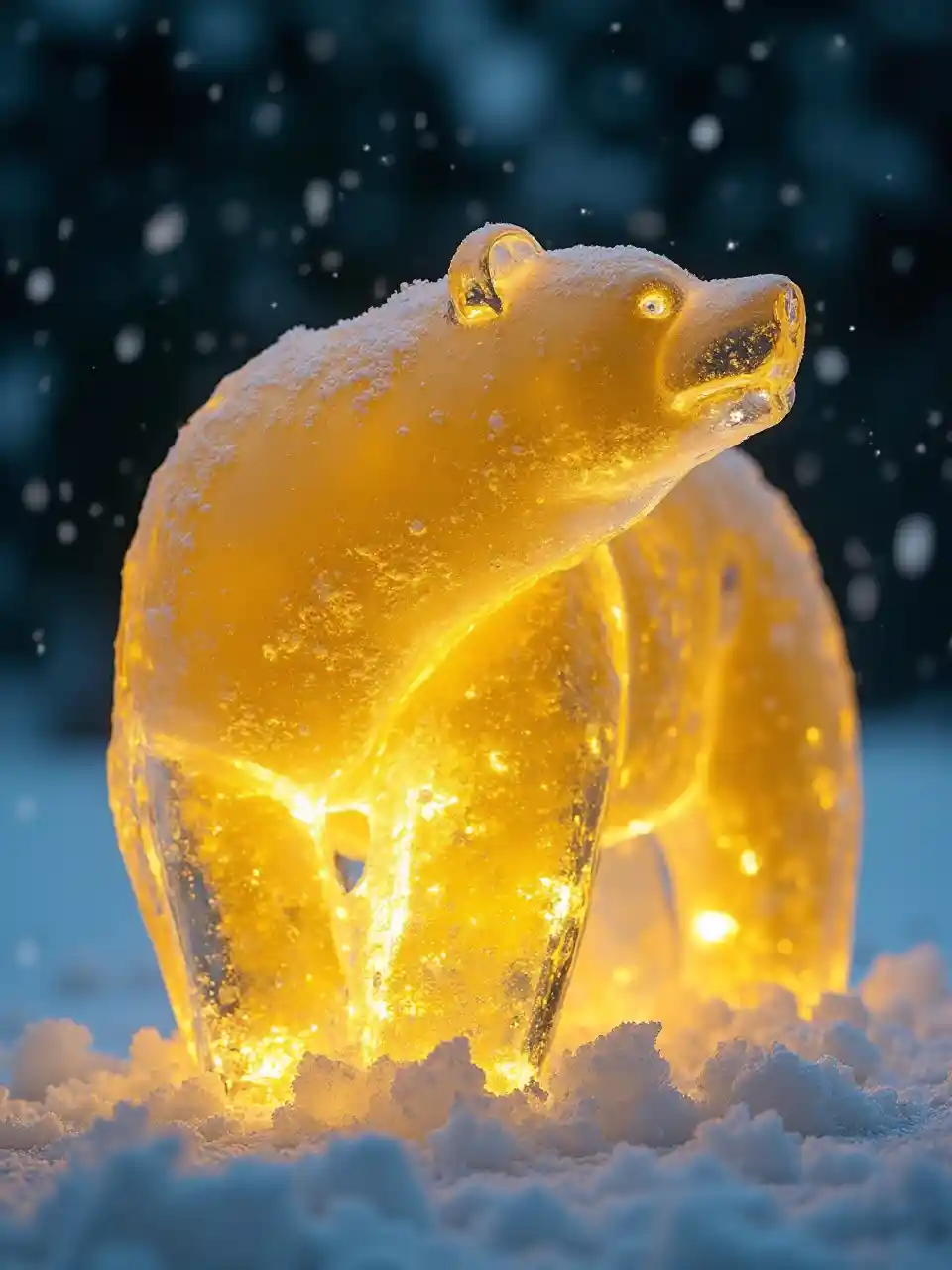 รูปปั้นน้ําแข็งสีเหลืองของหมีรัสเซียที่มีแสงชีวภาพ