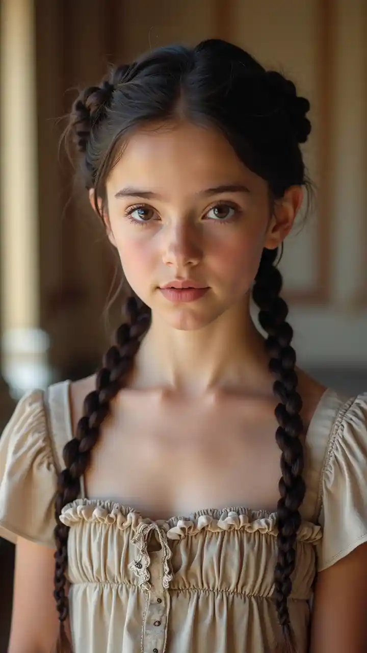 ภาพลัดหน้าของสาววัยรุ่นน่ารักที่มีฝ่าเข็มสีดําและตาดําของอิตาลี โดยสวมชุดขัดขวางและคอ