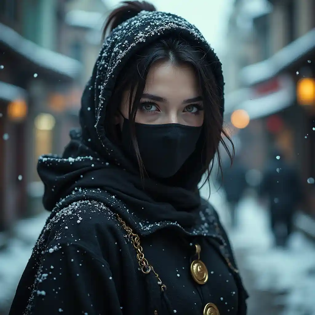 วอลเปอร์ 8K ของคนจินดาคนสวยอย่างลึกลับ wearing eyeliner และเครื่องประดับทอง ในถนนของเมืองที่หิมะมืดในรัสเซีย, ภาพ 8K