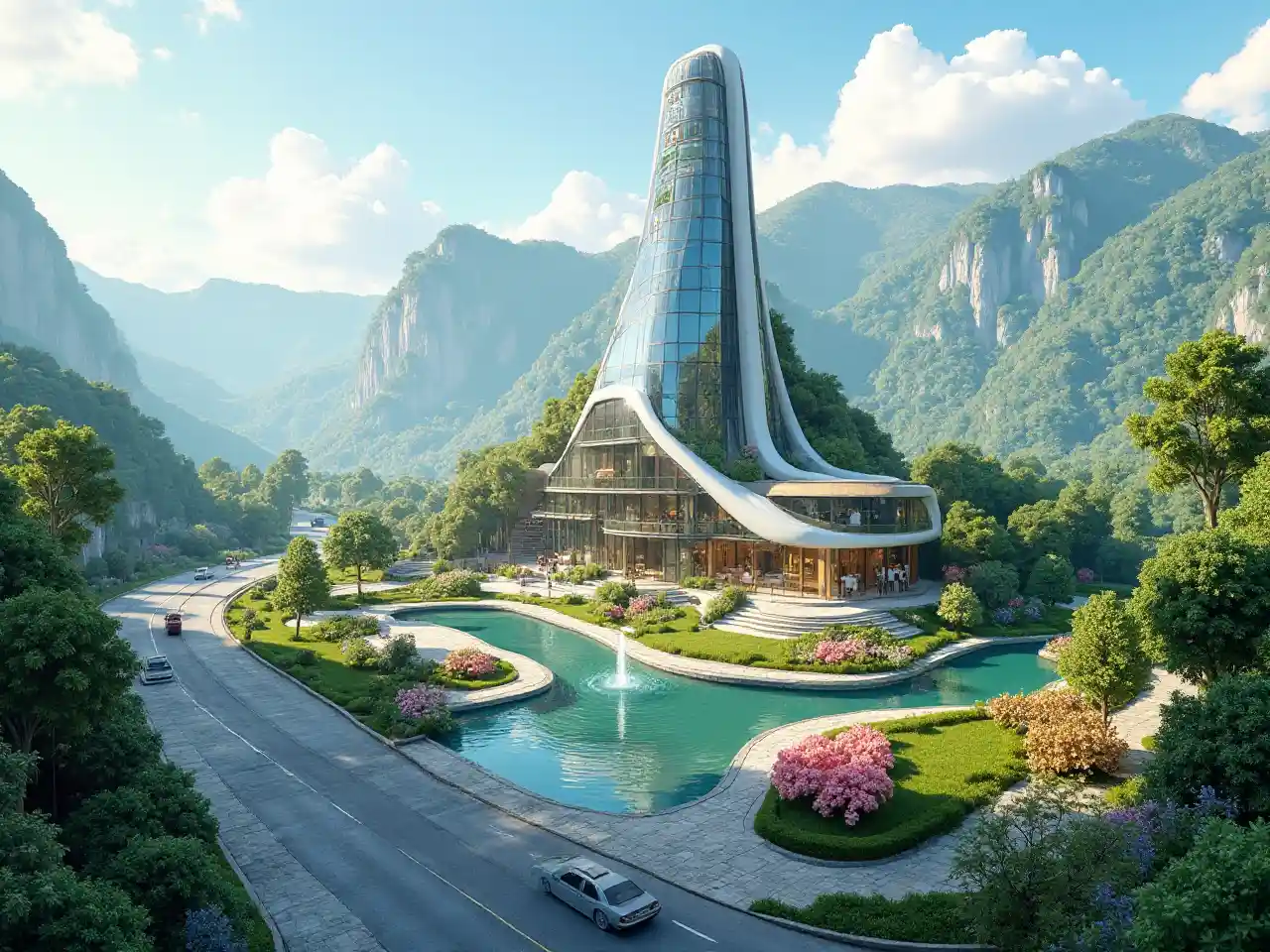 สร้างออกแบบอาคารหรูหราแบบฟุตซูริสต์ ด้วยกระจกขนาดใหญ่ สถาปัตยกรรมเรียบและทันสมัยที่มีส่วน, หอคอยแบบฟุตซูริสต์ที่มีโลโก้ FM FAMILY HOTEL, วันร้อน, ((ธงโฆษณา)), พืชและหลังเก่า, (ต้นไม้ไม้), ((ดอกสวน)), น้ําสว่างในสระ, ((ใกล้ทางหลวง))), ((ทางหลวง)), ((วิลล่าที่เรียบโดยหลังทอดก่อให้มีหลายพื้นที่ปลูกข้าวที่ติดภูเขา), ((ทะเลสาบกว), (ภูเขาหินอารมณ์) ((คุณภาพจริงสูง)