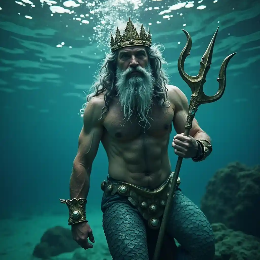 เจฟฟรีย์ ดีน มอร์แกน ในฐานะพระมหากษัตริย์ของปลาทะเล หางนางน้ําที่ส่องแสง ใต้น้ํา มีผมสีเทายาว มีขนสีเทายาว มีร่างกายกล้ามเนื้อสมบูรณ์ มีมงกุฎทําจากรายละเอียดทอง มีข้อมือทอง