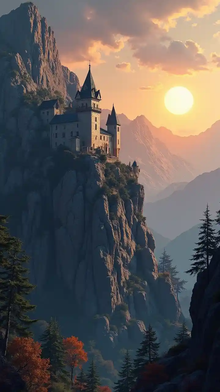 พื้นที่ภูเขาหินที่มีดวงอาทิตย์ตกต่ํา กับปราสาทที่ซ่อนอยู่บางส่วนในกิเลสขนาดใหญ่ ปราสาทควรมีส่วนสําคัญในกลาง