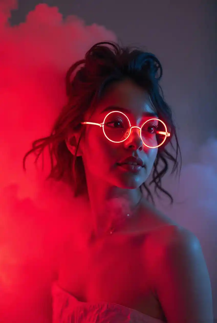 ผู้หญิงที่มีแว่นสีแดงในควัน