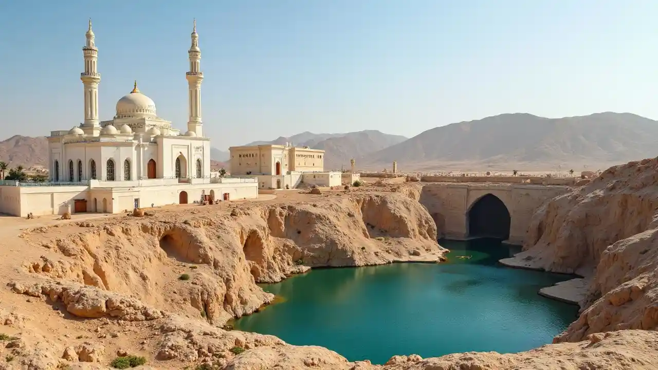 สร้างภาพขนาด A4 กับมัสยิดสุลทานคบูส ใหญ่, ป้อมนิวา, บิมม่า ซิงโฮล ซึ่งเป็นสถานที่ท่องเที่ยวในอมาน เพื่อวางในเอกสารอ้างอิงเป็นภาพเบื้องหลัง