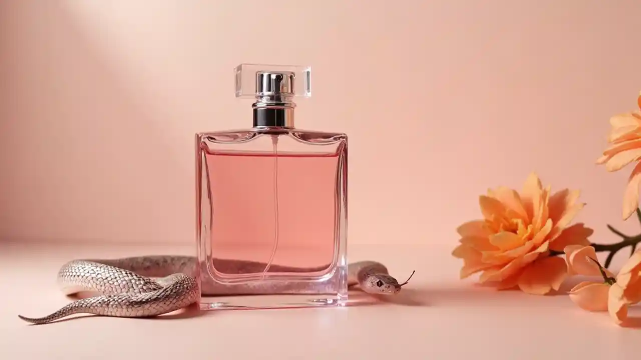 ขวดน้ําหอมสีชมพูแบบขั้นต่ํา งูอยู่ข้างขวด ดอกส้ม