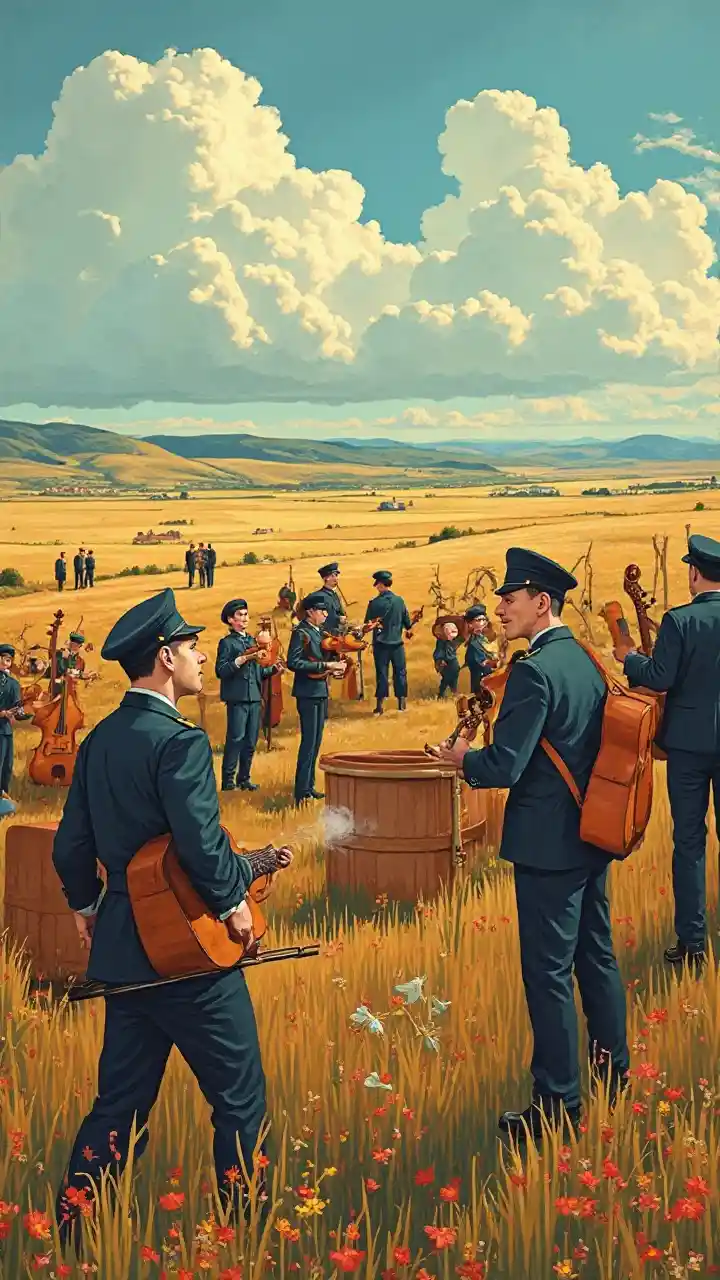 การวาดภาพของภูมิทัศน์โซเวียต ที่ใหญ่มาก อะไรที่สนามเต็มไปด้วยนักดนตรี แทนที่เกษตรกร ในสไตล์โฆษณา