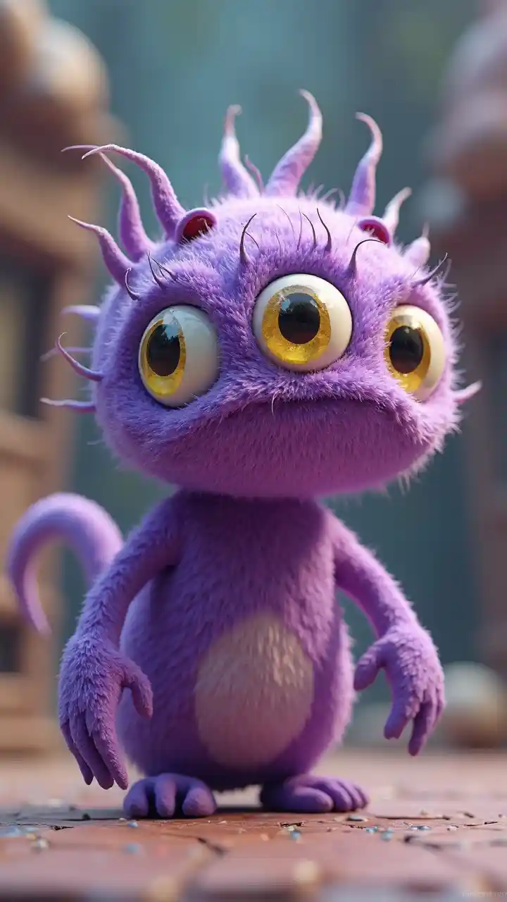 สัตว์สีม่วงขนาดเล็ก มีลักษณะภายนอกที่สวยงามและตาเหลืองที่น่าหลง แสดงด้วยรายละเอียดที่เหมือนชีวิตในสไตล์ 3 มิติแบบ Pixar โดยใช้ Unreal Engine หัวสองตัวที่มีอาการสองตัว และมีผลเป็นเลนส์ตาปลา สําหรับตาที่อลังการและสว่าง ขาและขาชี้ให้เห็นถึงความไม่สมบูรณ์แบบ ด้วยนิ้วที่บิด และรูปแบบที่ไม่คาดหวัง เพิ่มความน่าสนใจ ร่างกายยาวขึ้น ให้ความเห็นที่เหนือโลก โดยมีลักษณะที่ชัดเจน ด้วยร่างกายที่ซึรreal และไม่ชัดเจน รูปของสัตว์ทั้งที่น่าสนใจ และไม่ตรงกันอย่างน่าสนใจ ภาพที่สร้างสรรค์นี้ เป็นการผสมผสานขององค์ประกอบศิลปะ ที่โดดเด่น จากความละเอียดต่ํา และรายละเอียดที่มีเม็ด