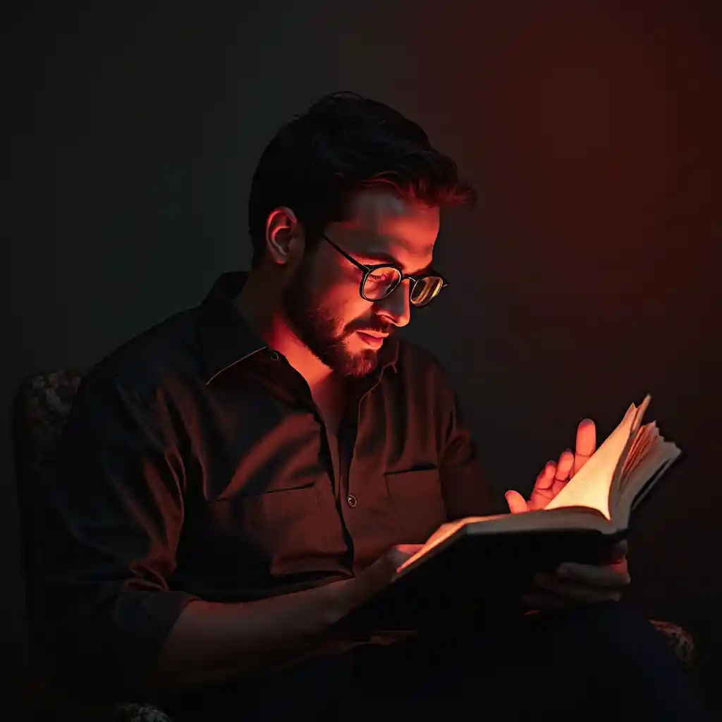 Scarlettสร้างภาพที่จริงเกินของชายผู้ใหญ่ที่สวมแว่นตา อ่านและเล่าเรื่อง