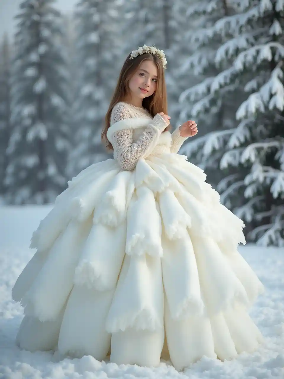 Bellaสาวรัสเซียสวยๆ ในสตูดิโอถ่ายรูป เธอสวมชุดขาวขนาดใหญ่ที่ดูเหมือนหมอน ฤดูหนาวรัสเซียที่มีน้ําแข็ง