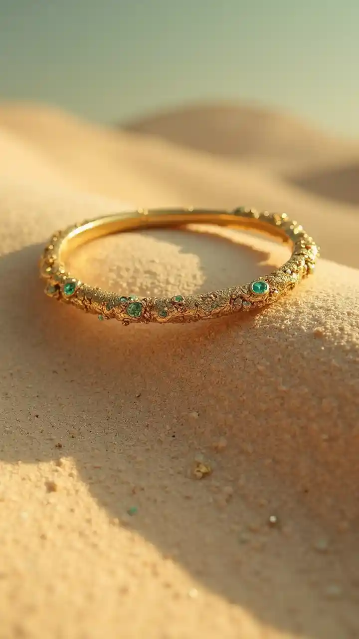 สร้อยข้อมือโค้งทองคําที่เสมือนเขาทรายอ่อนจากทะเลทรายที่แดดร่วง และมันอ่อน จากนั้นชิ้นเล็กๆจะหล่นลงมาเหมือนน้ําตกในเพชรสีเขียว