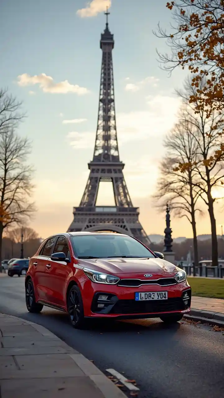 สปอร์ตคีอา ริโอ บนถนนของปารีส ใกล้หอคอยเอฟเฟิลในตอนกลางวัน