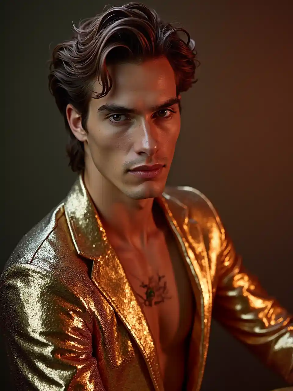 Aidenรูปแบบชายในชุดโลหะสว่าง สภาพถ่าย รูปสตูดิโอ รูปมืออาชีพ สีรวย รูปละเอียด หน้าละเอียด สไตล์ของเจมส์ บิดกูด