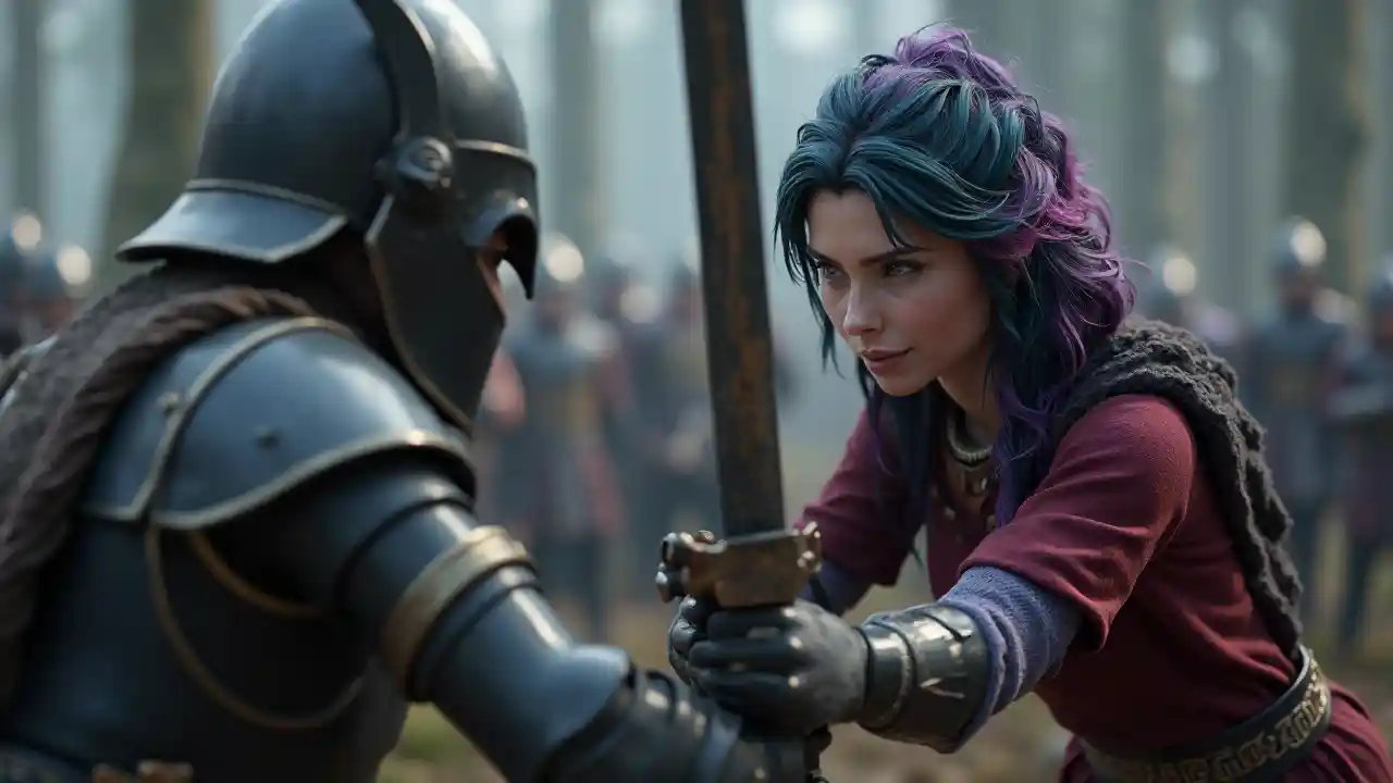 <mymodel>CGI Animation ศิลปะดิจิตอล ผู้หญิงไวกิ้งอายุ 20 ปี มีดวงตาสีม่วง เสื้อแขนยาวสีแดง มืด ใส่หมวกหันหิมะ ((ผมสีฟ้าดํา มีรอยสีสีแดง และสีม่วง)) สู้กับนักรบไวกิ้งอีกคน ในการสู้ด้วยดาบกับ Annabeth ที่มีผมสีม่วง กับเกราะสีดําและทองในวงฝึก ยิ้มซึ้ง