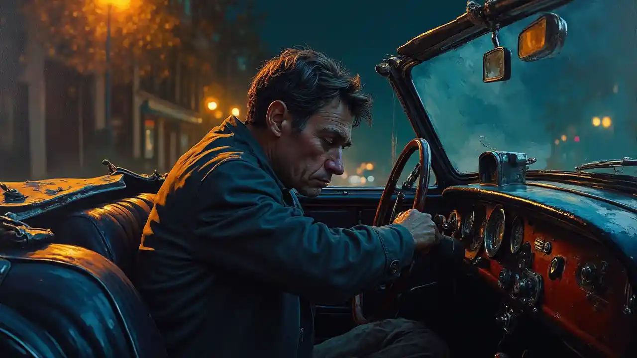(ภาพวาดน้ํามันอิมปาสโต้หนา) คนที่ร้องไห้เศร้า รถยนต์เก่าอังกฤษที่ลดลงบนล้อ (สีที่คันคันหนา) ที่ถูกส่องแสงจากถนน บรรยากาศกลางคืน บรรยากาศเศร้า