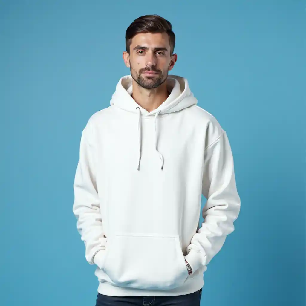 ชายสวมเสื้อฮูดสีขาว ขาวๆ มีพื้นหลังสีฟ้า