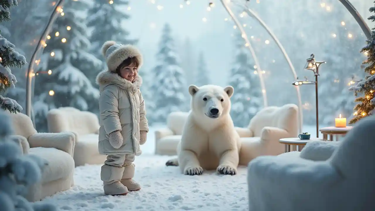จับภาพฤดูหนาวที่มหัศจรรย์ โดยมีเด็กผู้หญิงสาว 4 ปี ที่อยู่ในกลองโปร่ง เด็กหญิงที่สวมเสื้อหนาวสีขาวที่สบายๆ กับหมวกหนัง แขนนอและรองเท้าที่ตรงกัน ยิ้มหวานต่อกล้อง เธอยืนอยู่ข้างหมีขั้วโลกขนาดใหญ่ ที่นั่งอย่างสงบ กลางโบสถ์ ภาพที่เห็นคือ ภาพที่เห็นคือ ภาพที่เห็น ภายนอกโบสถ์ มีต้นไม้และต้นไม้ที่ปกคลุมด้วยหิมะ การส่องแสงมันอ่อนและน่าหลงใหล ทําให้มีอาการดีใจของเด็กผู้หญิง ภาพที่เกิดขึ้นทําให้เกิดความอบอุ่น ความประหลาดใจ และความสงบ ในช่วงฤดูหนาว ตั้งความละเอียดให้เป็น 30 MP ในรูปแบบ JPEG สําหรับการใช้งานมืออาชีพ
