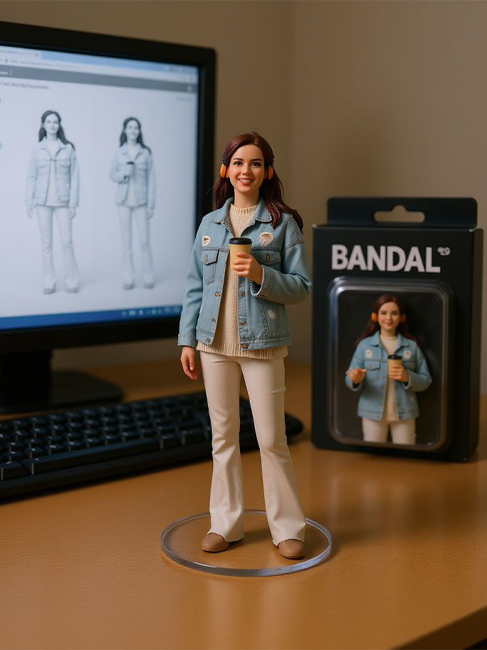 In seconds, the AI generates a full 3D-style collectible scene: your figure on a desk, a boxed version of the figure beside it, and even a design preview on a computer screen in the background.
