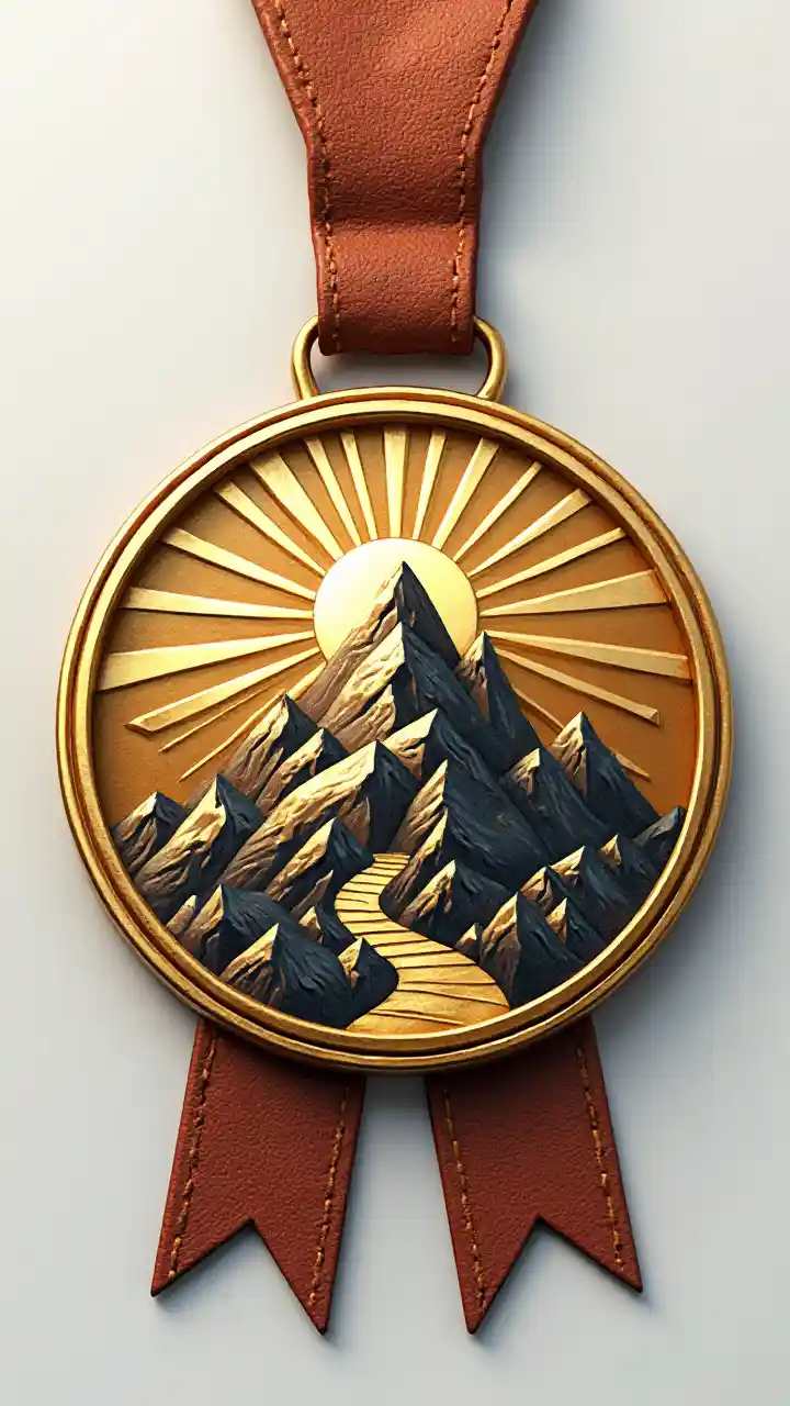 gerçekçi bir tarzda 3 boyutlu bir madalya çizin, metal altın, madalyanın şekli bir kurdele üzerinde yuvarlak, güneşin ışınlarıyla arka planında bir dağın bir parçası olarak, dağda en tepeye giden bir yol var →