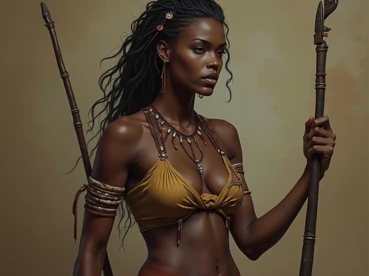 Afrikalı, savaşçı, amazon, kararlı, saçları örülmüş, sol kol seviyesinde bir kauri bileziği, sağ elinde bir mızrak,
