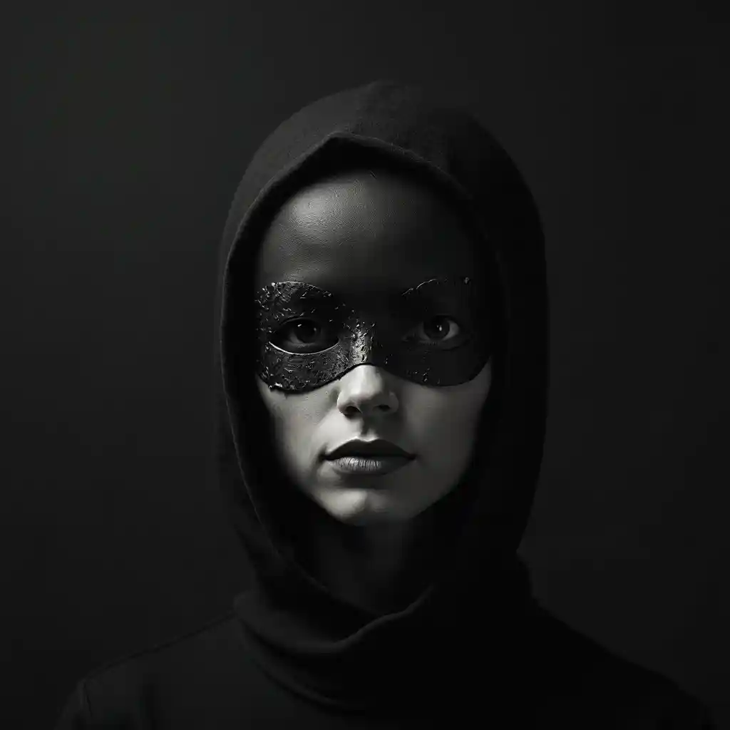 HenryEl işi maskeli kadın portre, minimalist, kasvetli, mistik, Bauhaus'tan esinlenmiş, çağdaş, gri ölçekli, tamamen siyah bir arka
