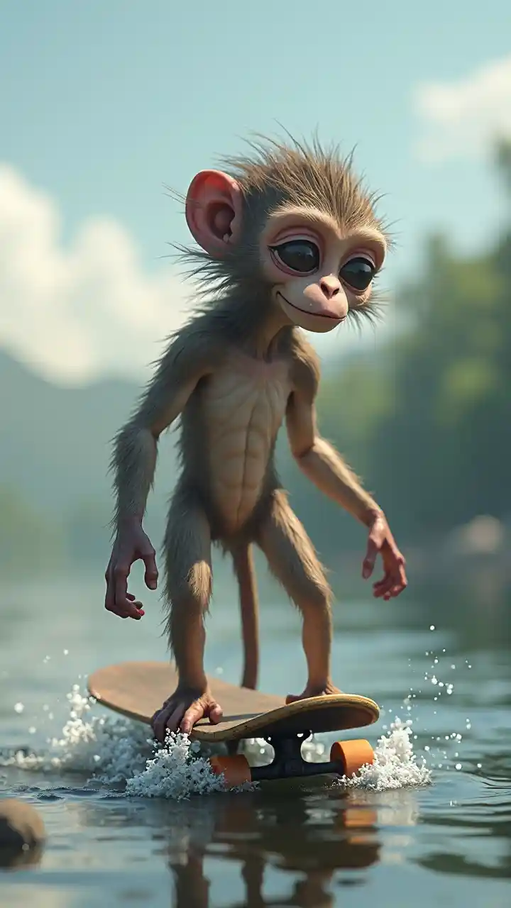 BenjaminBir gölde kaykay üzerinde uzaylı bir maymunun görüntüsünü oluşturur.