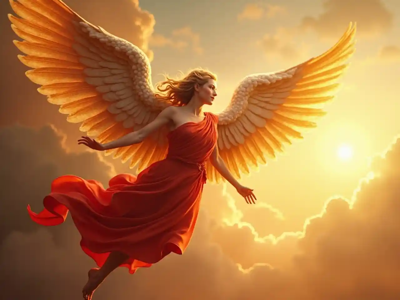 Gökyüzünde uçan aşk meleği, tam vücut, hiper gerçekçi, kırmızı altın renkler, sihirli stil. pozitif titreşimler, arka, gökyüzündeki ışık, güneş, parlak, görkemli, harika, destan, çok ayrıntılı Yunan insan yüzü, mükemmel yüz, doğru yüz