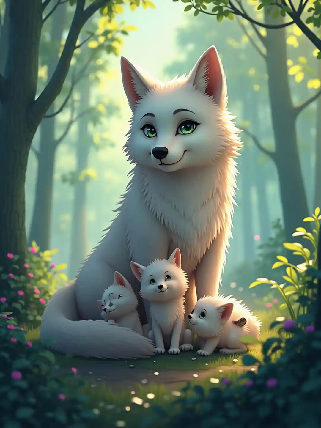 MiaEn iyi kalite, başyapıt, anime, peri masalı, pastel renkler, anne kurt ve yavruları, orman, ultra gerçekçilik, gerçek dışı 5 motor