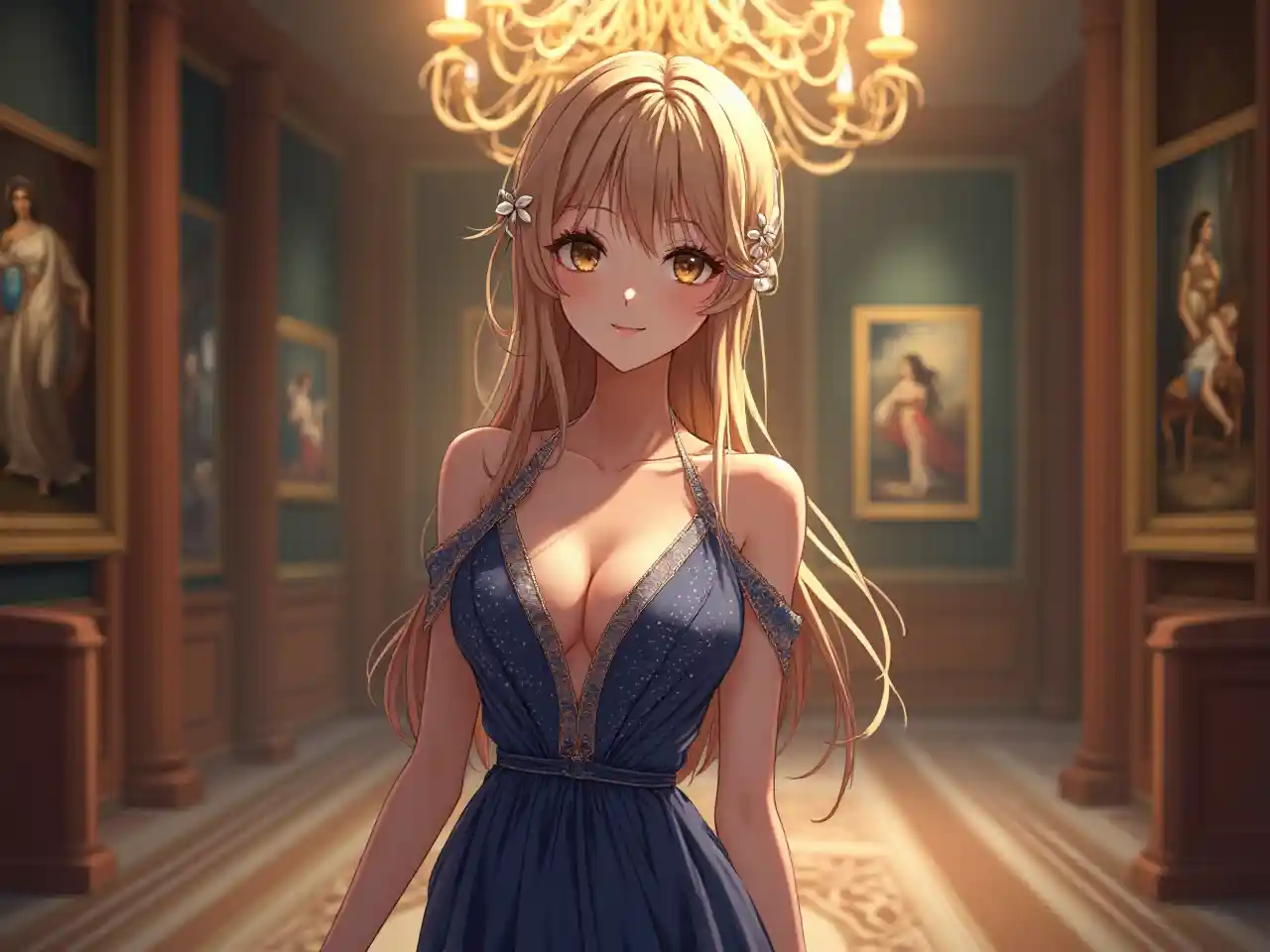 Ultra HD anime kızının nefes kesici bir şekilde muhteşem ve zarif bir boyuttaki yatay büyük boyutlu görüntüsü, klasik tablolarla kapalı bir sanat galerisinde dururken, dalgalan bir boyun ve açık kollu bir akşam elbisesi giyerek, inci bir tıraş ile süslenmiş uzun saçları ve nazik bir gülümsesi, geniş parıldayan gözleri, parıldayan cildini, derin altın ve mavi renk paletini, ince özelliklerini, kusursuz makyajını, sofisti ve sanatsal birbü, yumuşak bir parıltı ile sıcak bir aydınlatma, ince bir göğüs ve uzun, çekici ve zarif bir duruş ile.