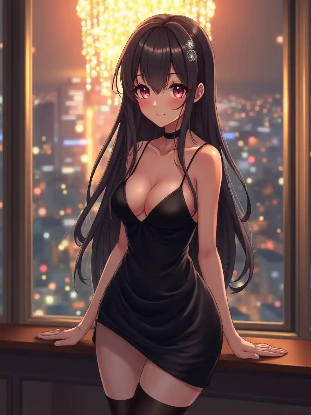 Ultra HD anime kızının dik büyük ölçekli görüntüsü, çarpıcı bir şekilde güzel ve duygusal, yumuşak bir kandil ışığı altında parlıyor, şehir manzaralı kapalı lüks bir çatı katında, derin bir boyun ve kalça yüksekliğinde zarif bir saten elbise giyiyor, elmas bir iple süslenmiş uzun saçları ve ışıl ışıl gülümüşleri, geniş gözleri, parıldayan ciltleri, derin gümüş ve siyah renk paletleri, hassas özellikleri, kusursuz makyaj, cazi ve sofisti bir titreşim, yumuşak bir parıl ve çevre aydınlatması, ince bir dekle ile, ve uzun, düzenli bir duruşla, çekici ve zarif bir şekilde.