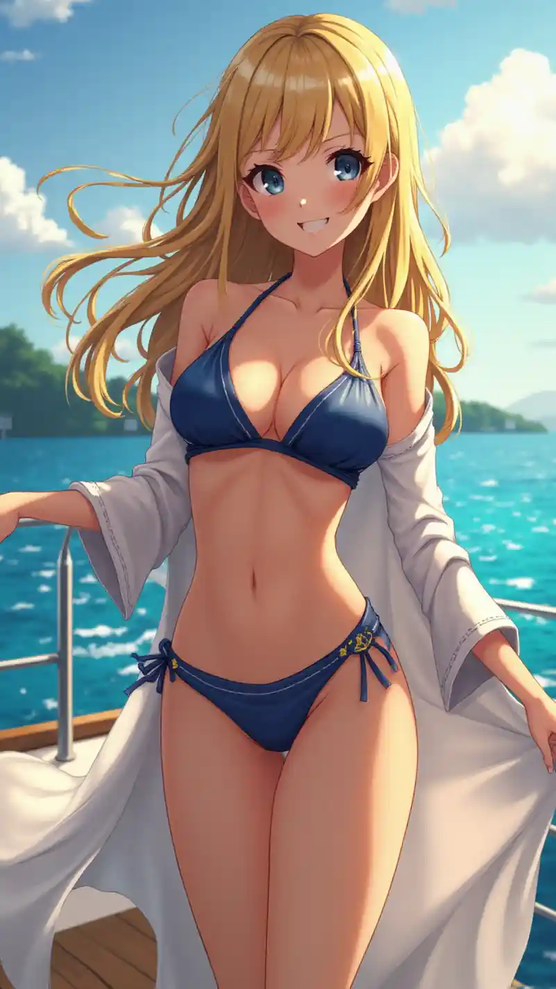 Ultra HD anime kızının dikey büyük ölçekli görüntüsü, parlak bir şekilde çarpıcı ve kendine güvenen, güneşin ışığında, açık havada bir yatta, derin bir boyun ve keskin bir sarongla lüks bir bikini giyen, deniz rüzgarında akıp giden uzun saçları ve kendine güvenen bir gülümseme, büyük ışıl gözleri, parlak cilt, sıcak mavi ve altın renk palesi, keskin özellikleri, mükemmel makyaj, cazi ve maceracı titreşimler, yumuşak parlak ve doğal ışık, çekici, iyi tanımlanmış göğüs ve uzun, rahat bir poz ile, güzellik ve güven ile